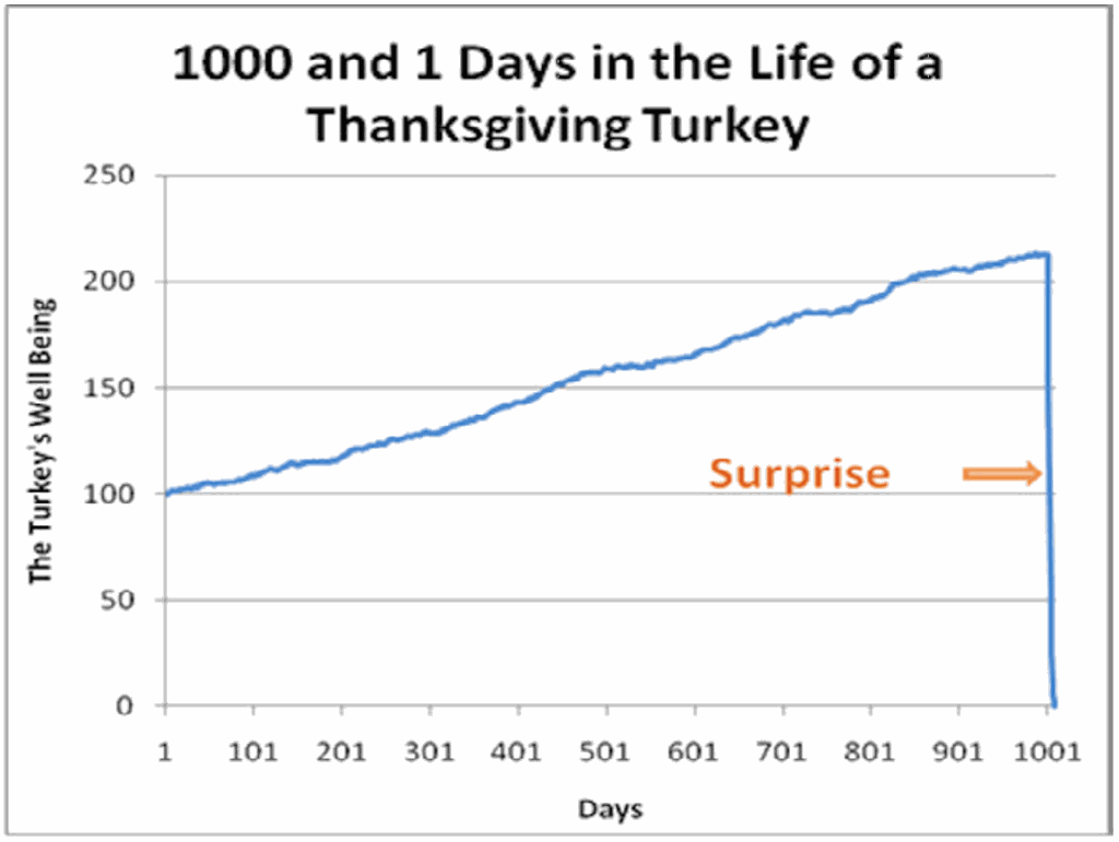 Taleb illustrerer dette fænomen ret enkelt sin bog med illustrationen ”The life of a Turkey”. Fra starten af livet møder kalkunen kun mennesket fra en positiv vinkel; den får mad, medicin, omsorg osv.